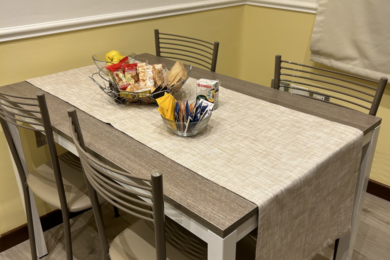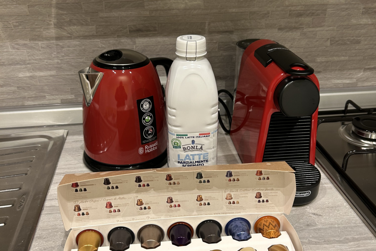 A corredo dell'appartamento vi sono macchinetta del caffè nespresso, bollitore dell'acqua, forno, piano di cottura, pentole, posate, piatti, bicchieri e tazze.