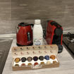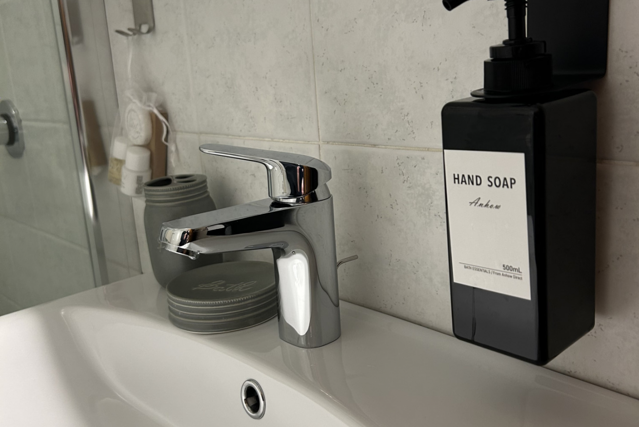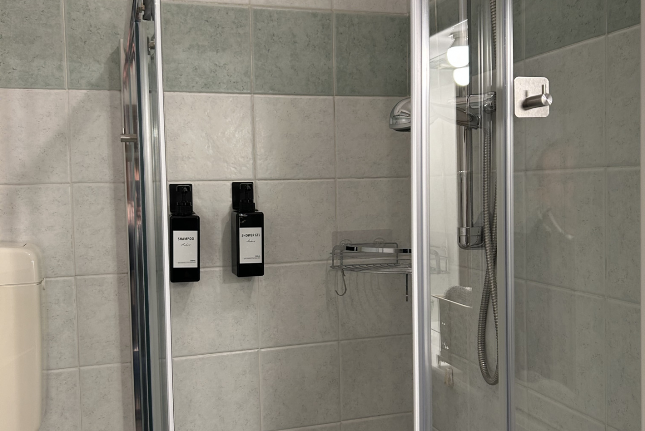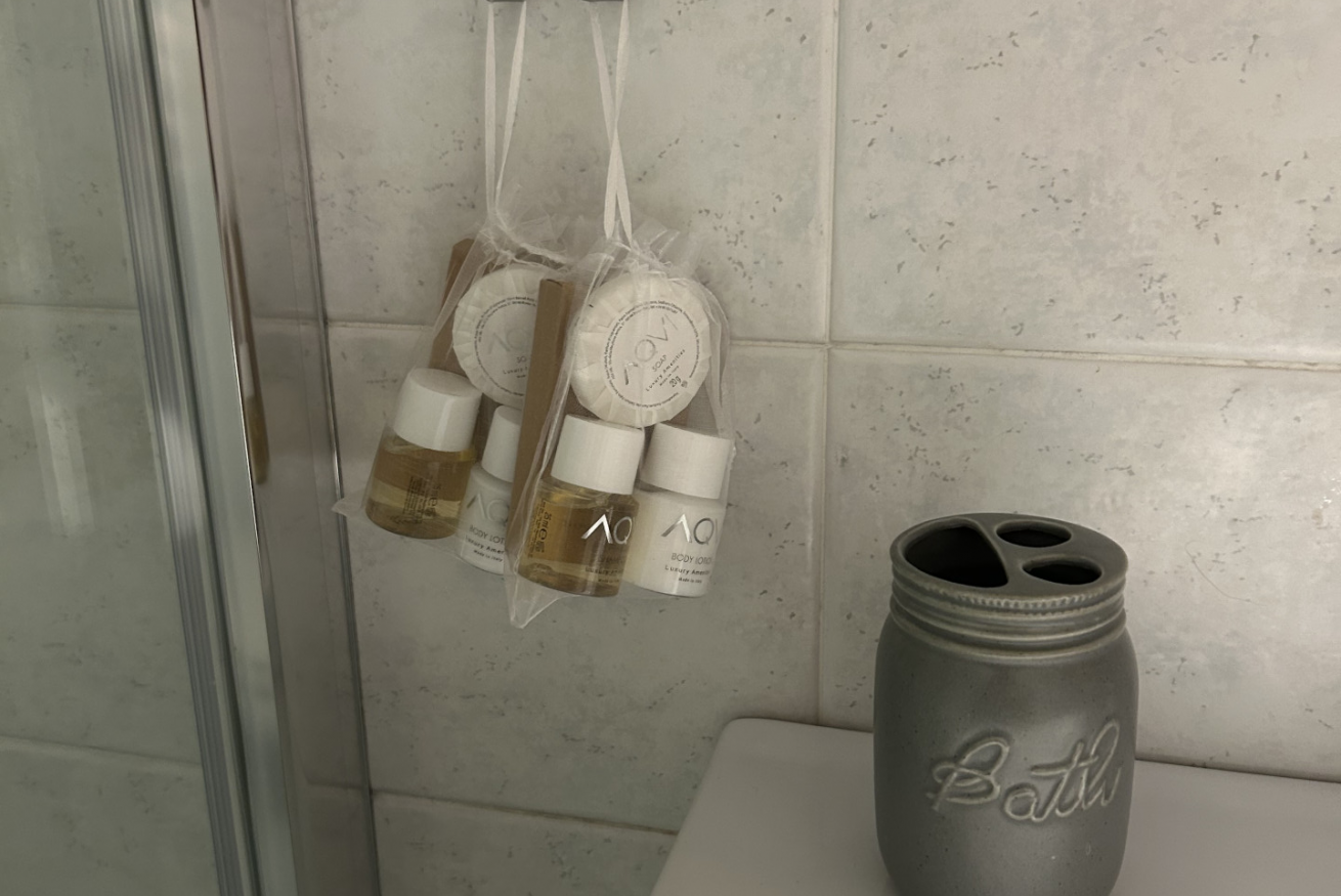 Vi sono inoltre l'asciugacapelli e i dispenser di shampoo, di doccia schiuma e di sapone per le mani.